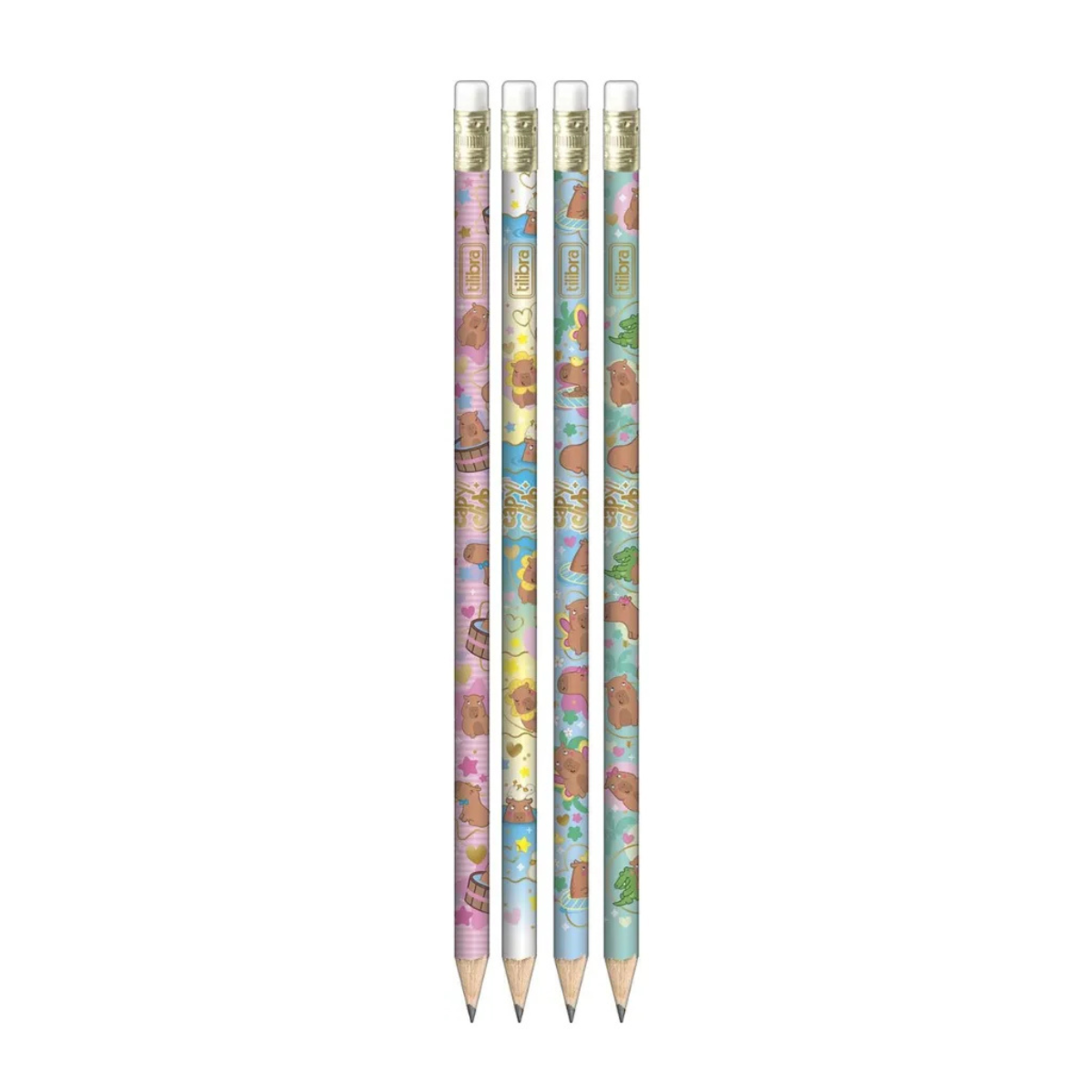 Kit com 4 Lápis Preto com Borracha Nº2 Capyclub Capivara - Tilibra Borracha nº2 Capivara da Tilibra. O produto, fácil de apontar, resistente e com um traço macio, é ideal para escrita e desenhos. Certificado pelo Inmetro, o lápis preto escolar da Tilibra vem com 190 mm de comprimento, borracha na ponta e corpo redondo, com efeito metalizado e estampa de Capivara. Leve já o lápis preto Capyclub Capivara e tenha sempre à mão um item confiável, bonito e eficiente para suas necessidades de escrita. Detalhes: Alta qualidade Comprimento: 190mm Fácil de apontar Madeira Maior resistência e durabilidade Marca exclusiva Mina: 2mm Modelo: Redondo Nº2 Produto certificado: INMETRO Traço macio Atenção: O KIT CONTÉM 4 LÁPIS SENDO UM DE CADA COR E ESTAMPAS DIFERENTES.