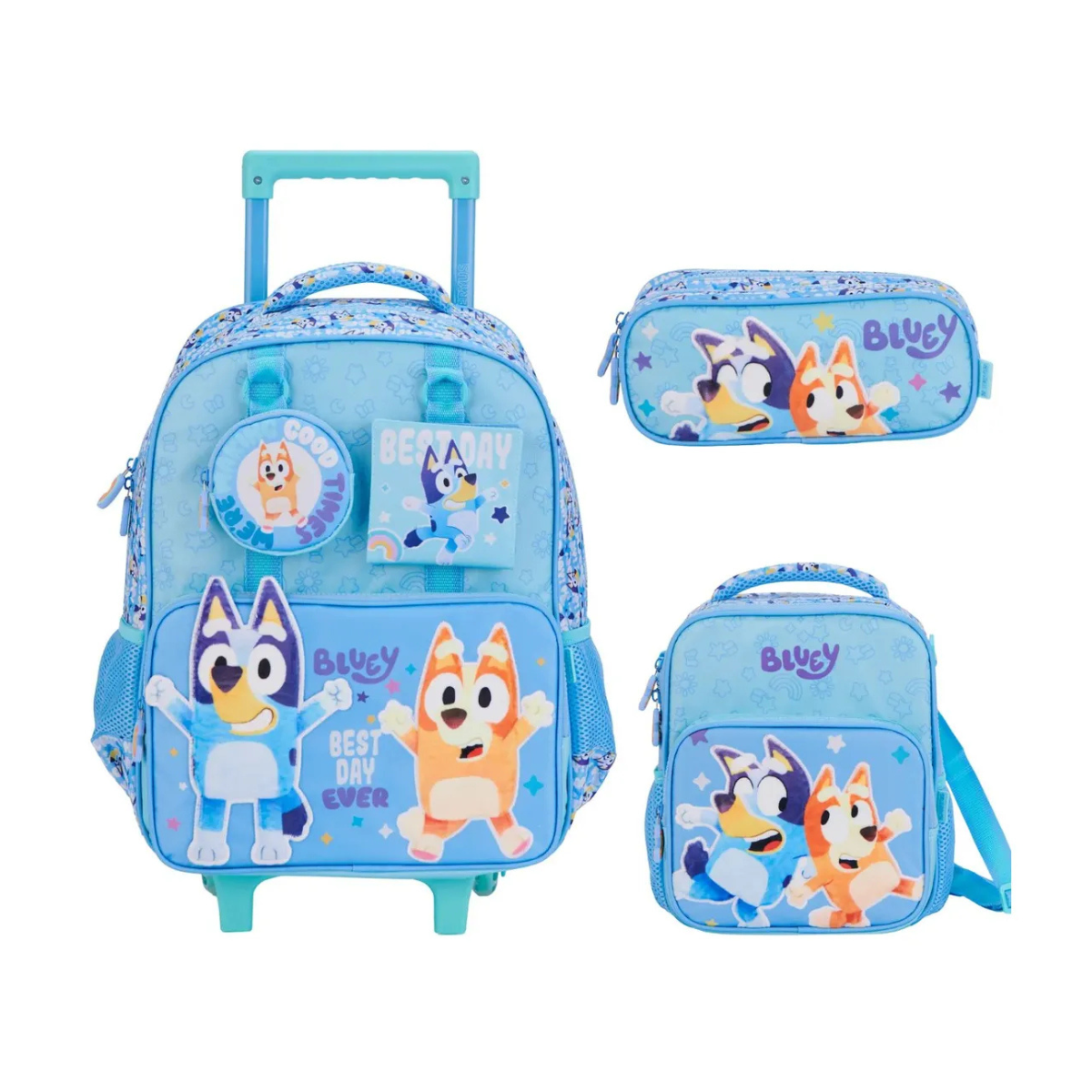 Mochila Escolar de Rodinhas Bluey A mochila com rodas do Bluey é uma excelente opção para carregar os materiais do seu filho para escola. Inspirada em uns dos desenhos animados mais conhecidos do momento, a mochila conta com um compartimento principal, bolso frontal, bolsinhas removíveis que podem utilizadas como bolsos extras e dois bolsos laterais para garrafas. Os pequenos vão amar ir pra escola com essa mochila lindíssima. Detalhes Material: Poliéster Medidas: 40cm x 30cm x 15cm Carrinho com rodinhas em silicone 1 compartimento principal 1 Bolso frontal 2 Bolsinhas removíveis 2 Bolsos laterais para garrafas Fechamento em zíper reforçado com puxadores personalizados Personagem na frente veludo Marca: Xeryus Lancheira Escolar Térmica Bluey Com a lancheira do desenho mais fofo do Bluey, as aulas ficarão muito mais divertidas. A lancheira possui um design super divertido e as crianças vão amar seu dia-dia de estudos. Qualidade superior, ela é toda projetada para maior conforto das crianças. Detalhes Medidas: 21 cm x 19 cm x 10cm Composição: 100% Poliéster | Forro 100% PVC térmico Sistema térmico Alça nas costas de pode ser alterada para alça transversal alça carona nas costas para fixação no carrinho Alça de mão Fechamento em zíper reforçado com puxador personalizado Personagem em patch de veludo de alta qualidade Marca: Xeryus ESTOJO ESCOLAR DUPLO BLUEY Com o estojo escolar do Bluey as aulas ficam mais divertidas. Este estojo infantil dispõe de dois compartimentos para armazenamento de lápis, canetas, canetinhas, giz de cera e os demais materiais escolares que as crianças usam no dia-dia. Detalhes Medidas: 21,5cm x 9cm x 7cm Material: Poliéster Frente com patch dos personagens em veludo 2 compartimentos grande fechamento em zíper reforçado Puxadores personalizados Marca: Xeryus