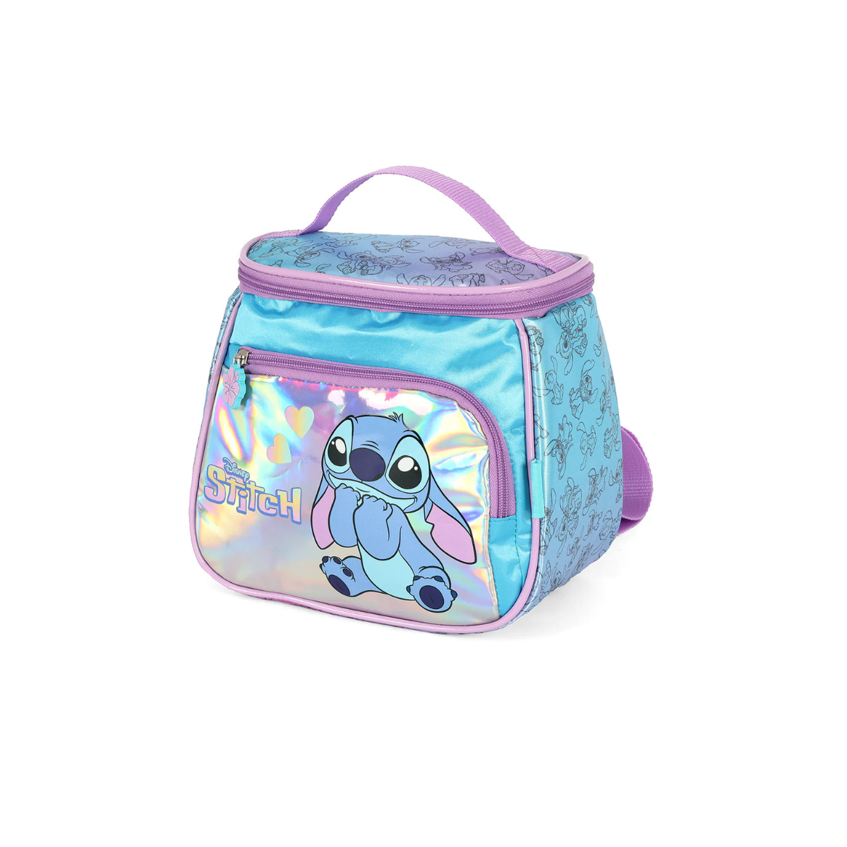 A lancheira LA42413SC faz parte da coleção Holográfica do Stitch Disney, trazendo estampa exclusiva e design funcional. Confeccionada em poliéster resistente com forro em PVC, garante durabilidade e facilidade de limpeza.