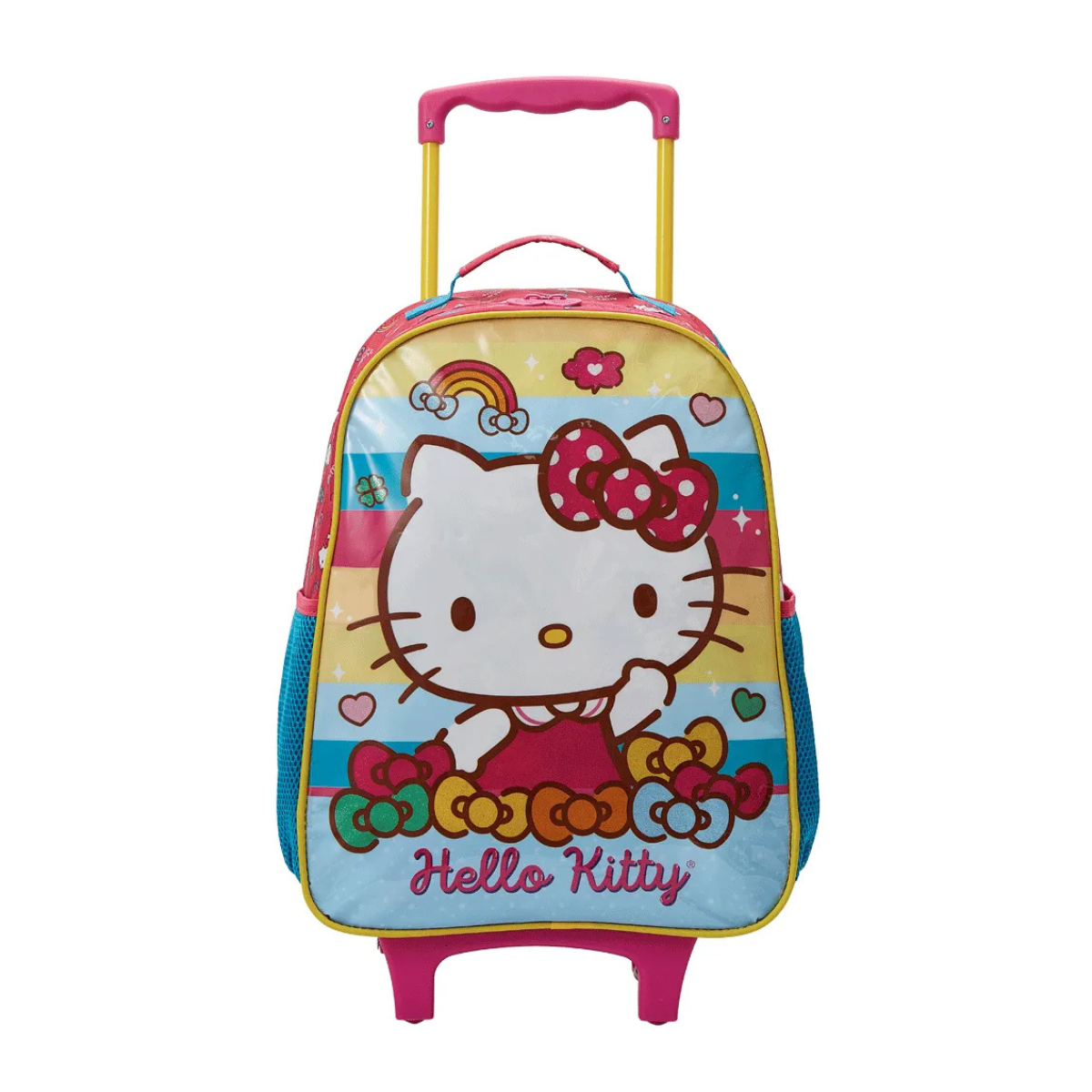 Mochila de rodinhas, lancheira e estojo Hello Kitty traga a doçura e o charme de Hello Kitty para a rotina escolar dos pequenos! Transforme a volta às aulas em uma experiência mágica com o estilo icônico da Hello Kitty. Nossos produtos licenciados Sanrio são feitos com materiais resistentes e acabamento impecável, ideais para acompanhar as crianças em cada nova descoberta. Material: PVC glitter, poliéster 420D e lancheira com PEVA DIMENSÕES: Mochila - Largura: 27cm - Altura: 35cm - Comprimento: 14cm