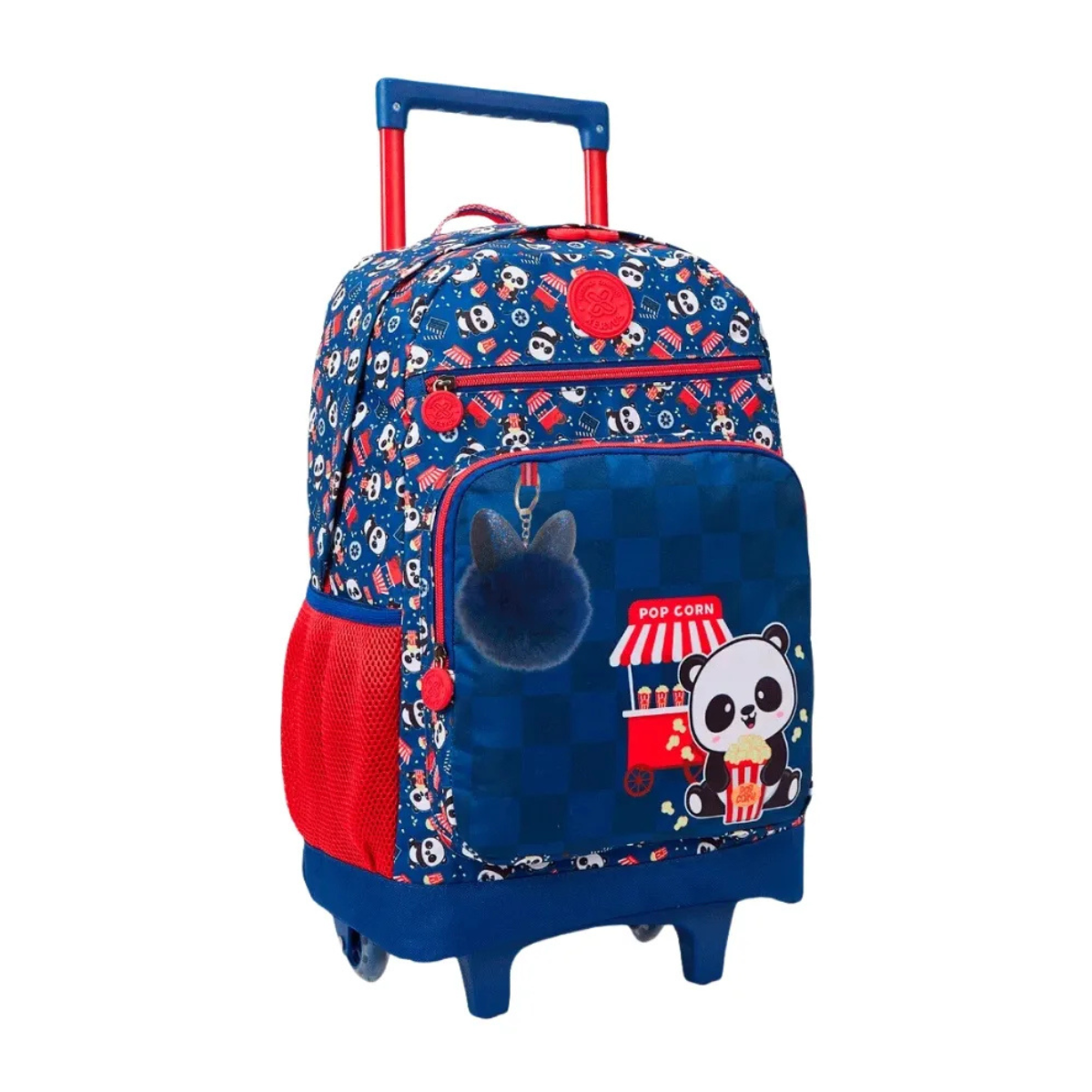 Mochila de Rodinha Escolar Grande Panda Pipoca Cinema Azul Mochila de Rodinhas Panda Pipoca Tamanho 16, criada para garantir conforto, estilo e praticidade em todas as atividades escolares. Fabricada em poliéster 300D, oferece alta durabilidade, resistência e fácil limpeza, suportando o uso diário sem perder o visual encantador. Seu design alegre combina as cores azul escuro e vermelho com uma estampa divertida de um panda comendo pipoca, transmitindo um toque de fofura e descontração. O modelo conta com detalhes especiais que tornam a mochila ainda mais atraente, como pompom decorativo e puxador personalizado, que completam o visual moderno e exclusivo. O sistema de rodinhas reforçadas e o puxador retrátil facilitam o transporte, permitindo que a criança leve seus materiais escolares com mais conforto, sem esforço. A mochila é espaçosa e bem distribuída, possuindo 5 bolsos: 1 principal amplo para cadernos, livros e pastas, 2 bolsos frontais perfeitos para guardar pequenos objetos e acessórios, e 2 bolsos laterais ideais para garrafinhas ou itens de uso rápido. Seu interior é forrado e estruturado, oferecendo proteção extra ao conteúdo. Com capacidade adequada para o uso escolar diário, a Mochila de Rodinhas Panda Pipoca une funcionalidade, resistência e um design encantador, sendo a opção perfeita para acompanhar o dia a dia com muito estilo e praticidade.